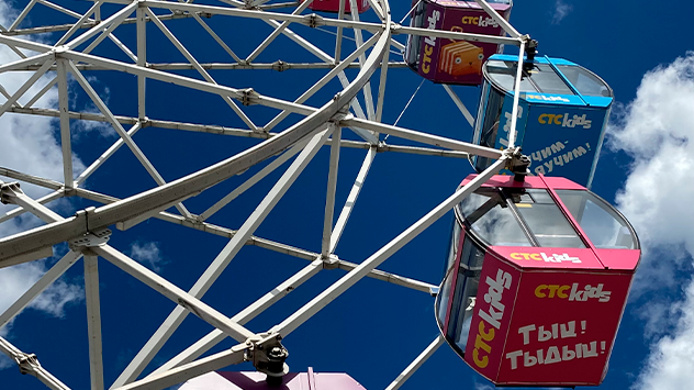 Колесо обозрения в детском парке развлечений «Сказка» в ярких цветах телеканала СТС Kids ждет посетителей каждый день с 10 до 22.